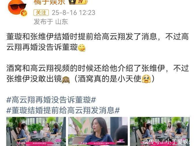 董璇再次步入婚姻的殿堂,她与她的再婚丈夫张维伊一同参与了综艺节目《姐姐当家》。在节目播出时,董璇透露高云翔已经再婚并有了孩子。然而,高云翔并未将此事透露给董璇。当董璇再次步入婚姻的殿堂时,她通过短信告知高云翔。